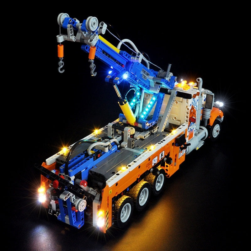 Light up the world of engineering with this Heavy-duty Tow Truck 42128 light kit, which provide an easy way for Lego fans to illumiate Lego models with high-quality LED lighting material. We add warm white lights, red lights, white lights to the tow truck toy and this lighting parts make your Truck model from dark to bright. The lights are purely handmade. You can connect the USB cable with a battery box, a power bank, an USB-socket or an wall adapter to light up the Heavy-duty Tow Truck.