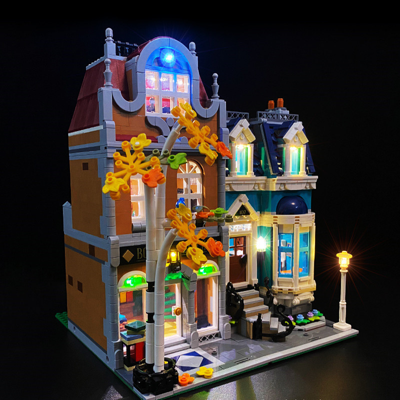 The effect of the lighting on the LEGO® Bookshop set is transformation, turning it into a captivating display piece that draws the eye and stirs the imagination. It's not just the visual appeal that's enhanced; the lighting adds a layer of storytelling, suggesting a vibrant community where the bookshop is a beacon of knowledge, relaxation, and community gathering, even after the sun sets. This illuminated bookshop becomes a centerpiece, a symbol of the warmth and charm that books bring into our lives, rendered in miniature but no less impact.