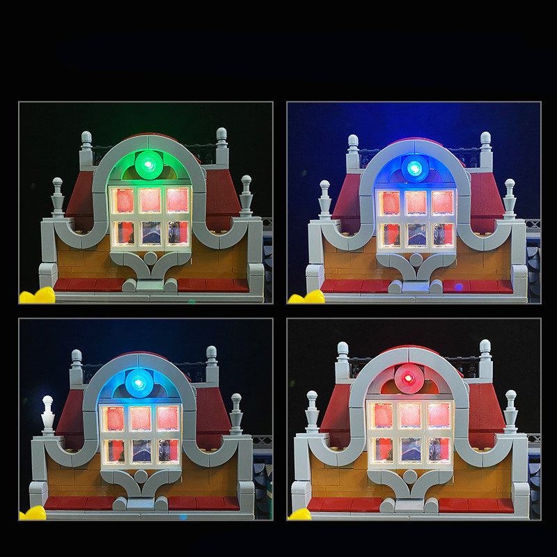 The adjacent townhouse, part of the charming modular set, also benefits from the subtle lighting, highlighting the architectural details and the life within. Windows light up floor by floor, revealing a slice of minifigure life and adding depth and realism to the entire scene.