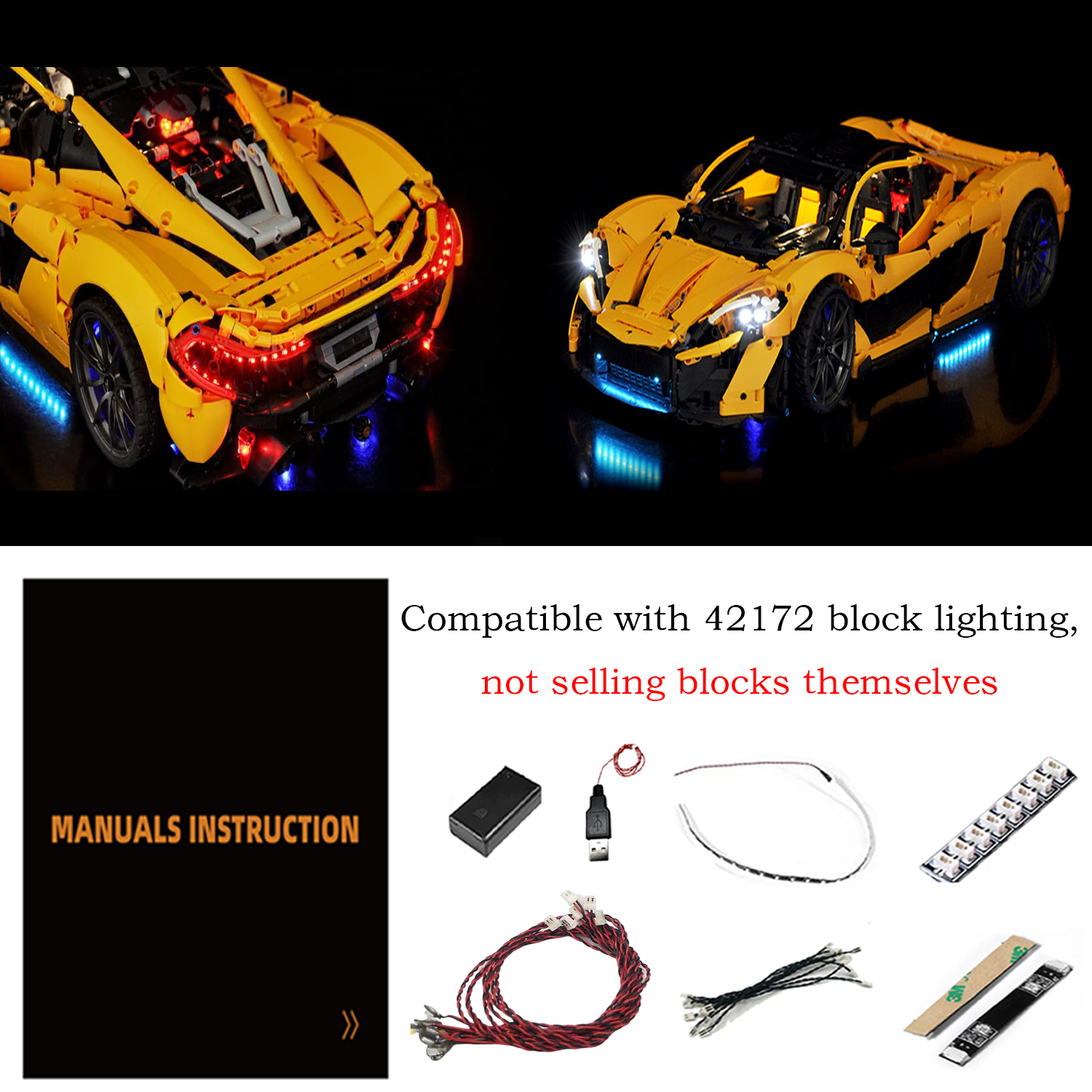 Transform your LEGO® McLaren P1™ into a sleek and illuminated masterpiece with our custom lighting kit. The vibrant lights highlight every curve and detail of this iconic supercar, bringing it to life with a stunning glow. Whether you're showcasing it on display or adding it to your collection, the lights create an eye-catching effect that enhances the realism and allure of your build. Illuminate your LEGO McLaren P1™ and watch it race into the spotlight!