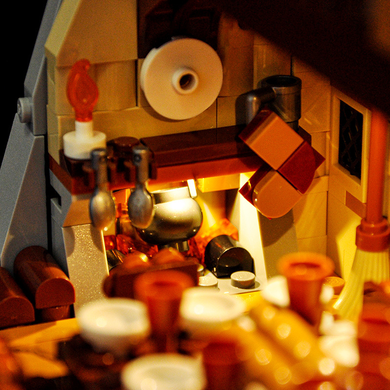Outside, the surrounding foliage is touched by light, creating a magical ambiance that complements the cottage’s charm. The effect is mesmerizing, transforming the set into a living piece of the story, where every brick and every minifigure plays a part in the narrative being told.
